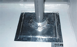 Cut approprate shape based on the pipe's diameter and overlap area on both sides of wall and floor.